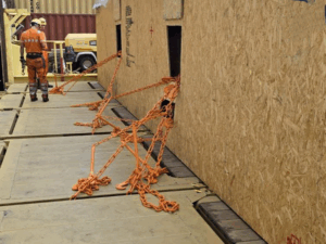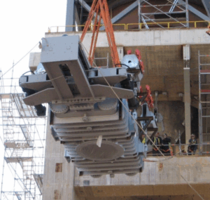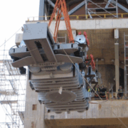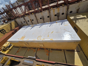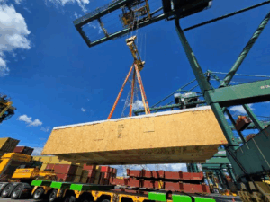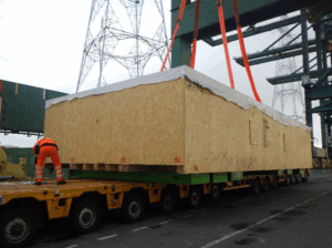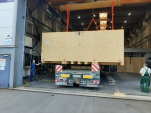 On the sea vessel, the crate was loaded onto six 40′ platforms with the help of the container bridge. For cargo securing and lifting, special openings/hatch covers were partly built into the packaging to ensure safe transport. Once the shut-off valve was safely stowed, it was then transported by sea from Antwerp to Kolkata, India.