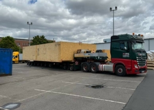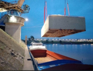 The shut-off valve was packed in a crate measuring L x W x H: 1370 x 632 x 253 cm. The crate was then transported by truck to the inland port of Krefeld. There, it was transferred onto a barge bound for Antwerp. At the terminal in Antwerp, the crate was then loaded onto a modular trailer for temporary storage before being stored on heavy-duty carriers until the ship’s arrival.